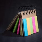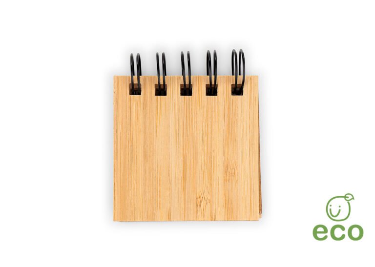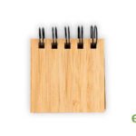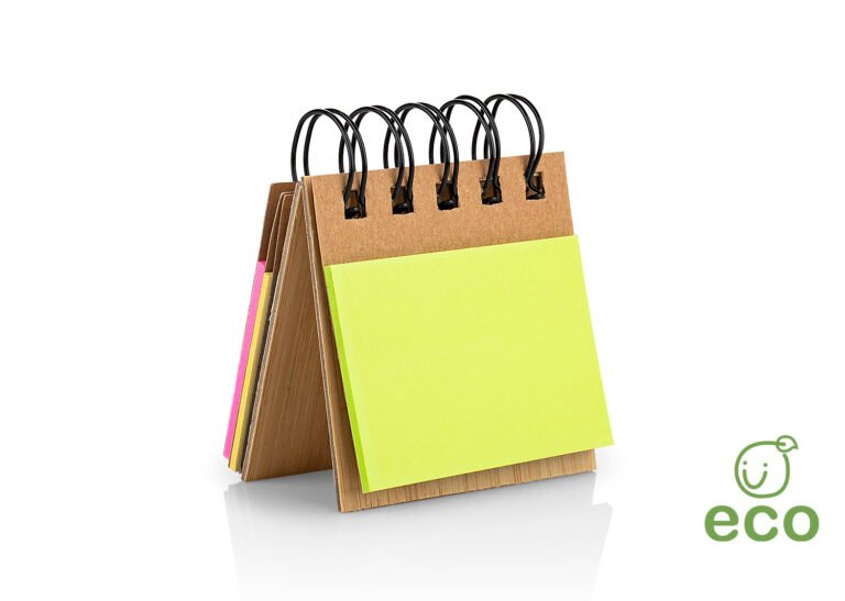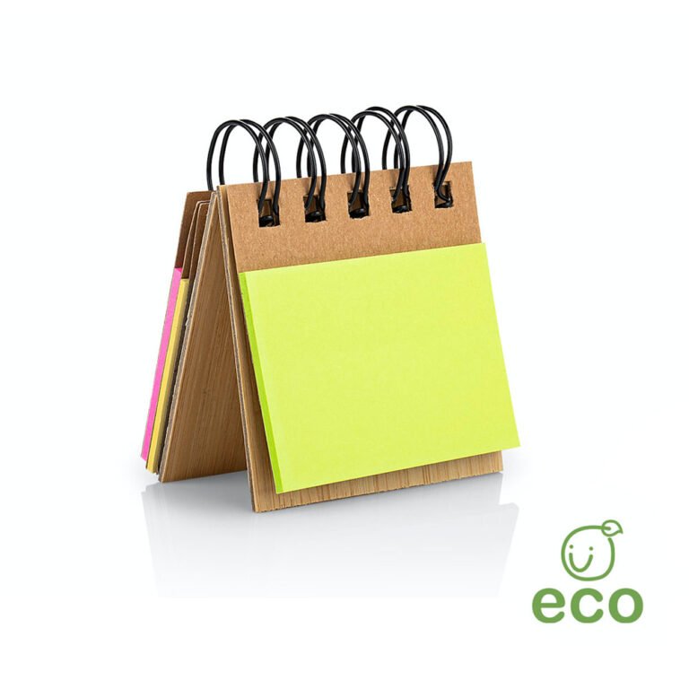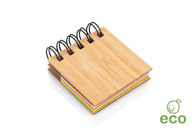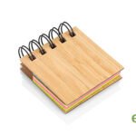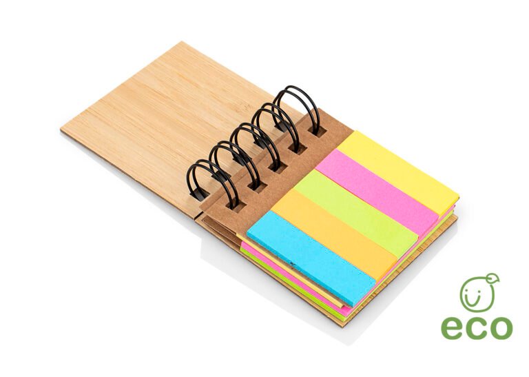 Set de memos con argollado doble O y cubierta en Bambú. 3 set de memos adhesivos por 40 hojas y 5 colores de banderas en papel x 25 unidades cada color.