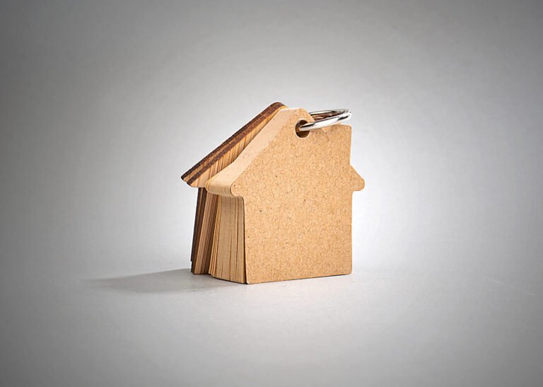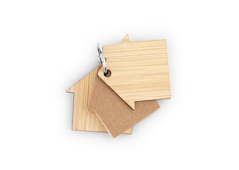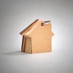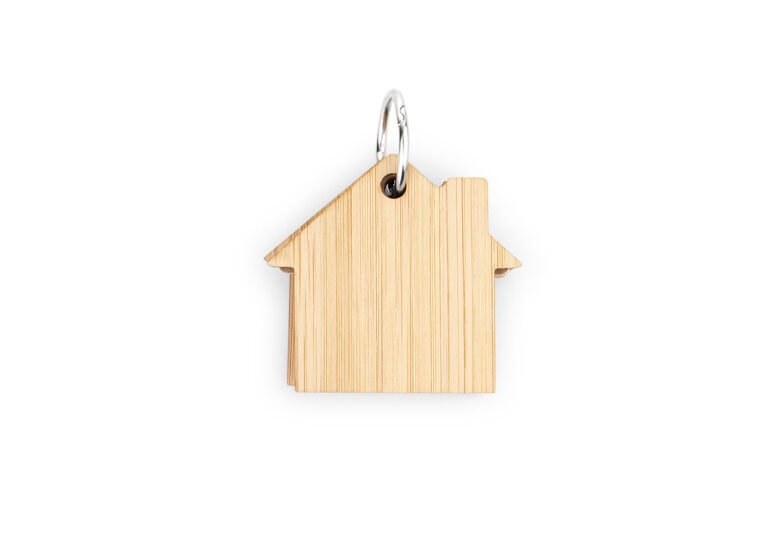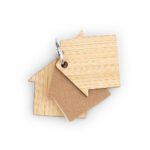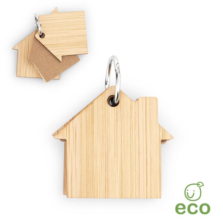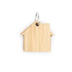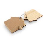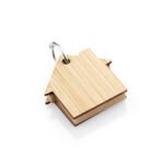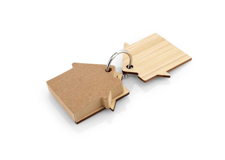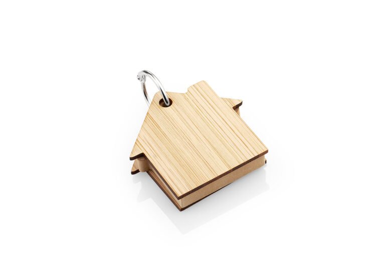 Llavero de bambú con 80 hojas de memos adhesivos en papel reciclado color natural en forma de casa.