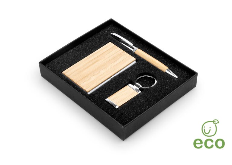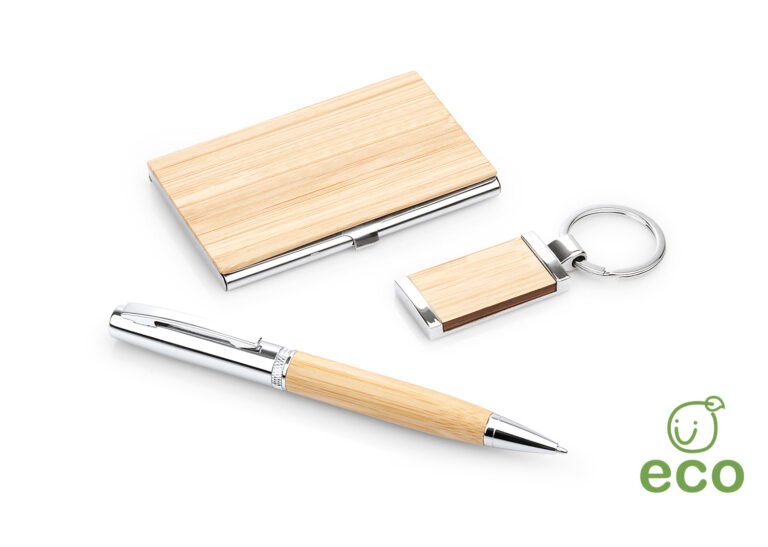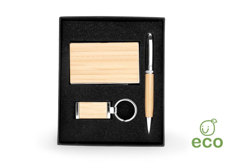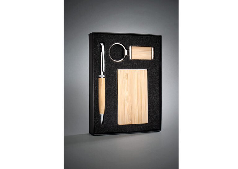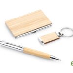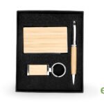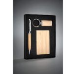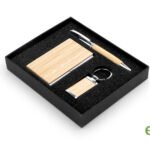 Set ejecutivo, incluye porta tarjetas metálico, llavero metálico rectangular y bolígrafo en Aluminio con sistema twist, todos con acabados en Bambú para la marca en láser, caja de regalo negra