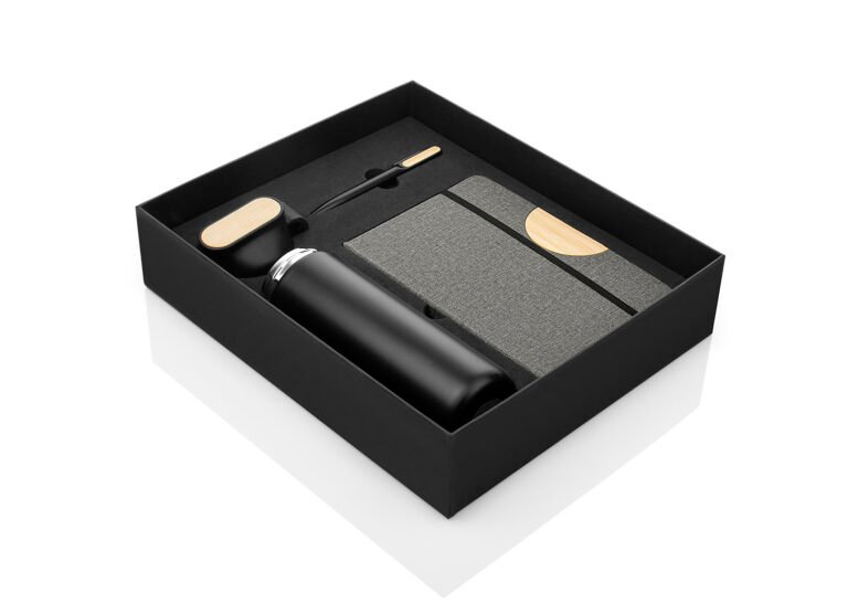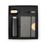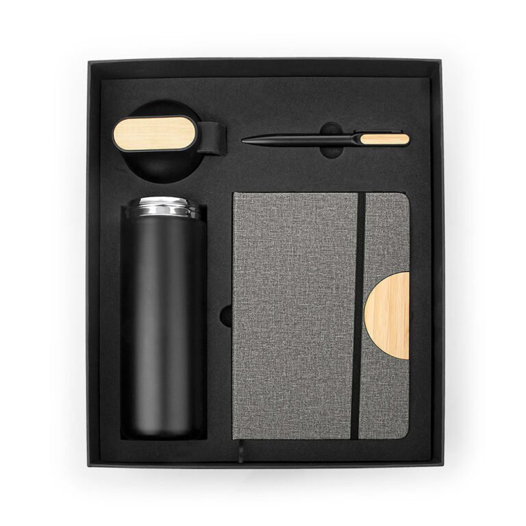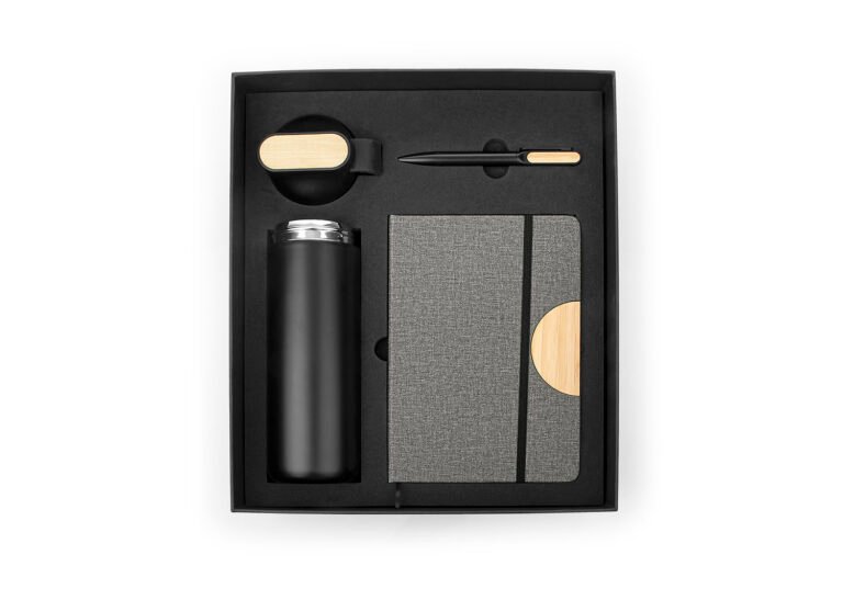 Set ejecutivo con estuche de lujo. Incluye bolígrafo en aluminio con sistema twist, Libreta con 80 hojas rayadas, banda elastica de cierre lateral, cinta marcadora y portabolígrafo. Mug de 600 ml con tapa de Bambú / 20 Oz en acero inoxidable con tapa rosca y banda de silicona para transportar con facilidad. los 3 elementos tienen un detalle en Bambú para marcar en láser.