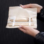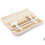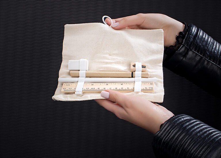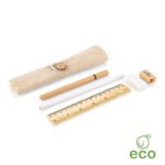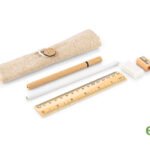 Set de escritorio en estuche de algodon. Incluye bolígrafo con tapa y tinta negra, borrador, lápiz, tajalápiz y regla de 15 cm ó 6 Pulgadas.
