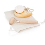Kit para el cuidado facial que estimula la microcirculación y mejora la apariencia de la piel, reduciendo la aspecto de los ojos cansados. Incluye un rodillo de madera, un cepillo facial ultra suave y una bolsa de algodón que resulta práctica para guardar y transportar.