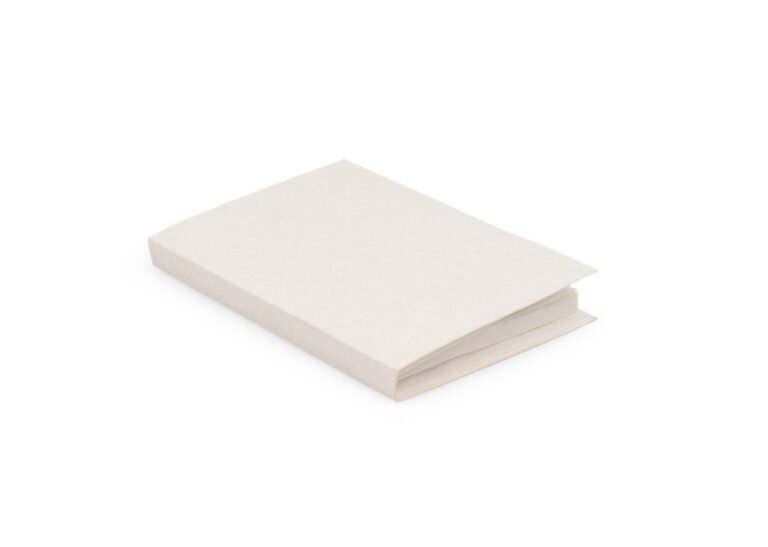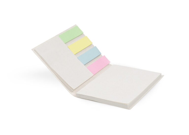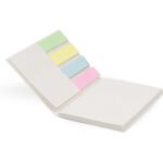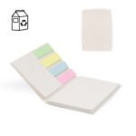 Set de memos con cubierta dura elaborada en material recuperado de cajas Tetra pak. Incluye 4 juegos de banderas adhesivas en papel de colores de 25 hojas cada uno.