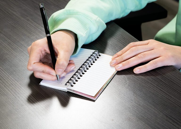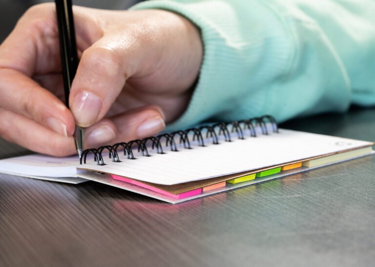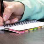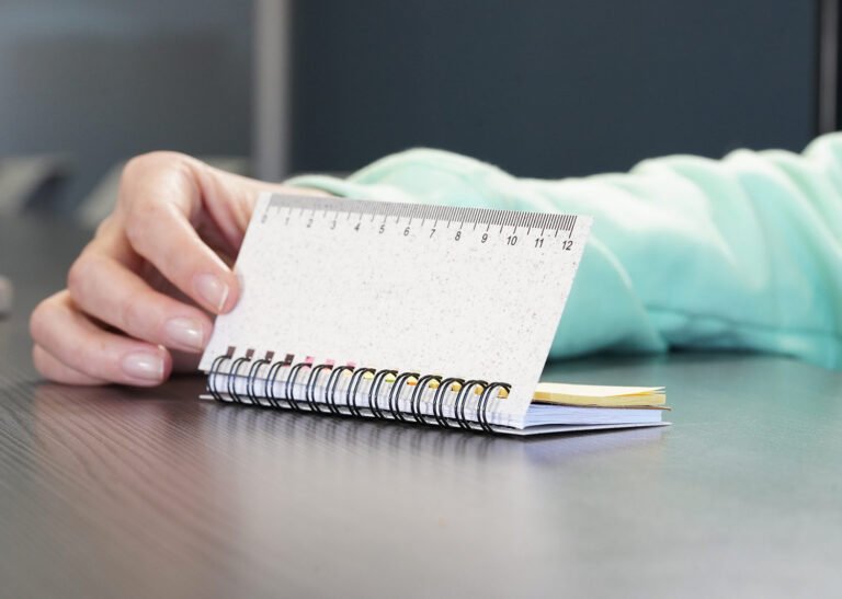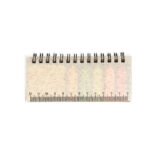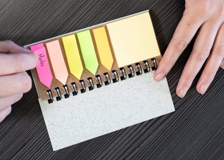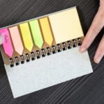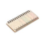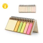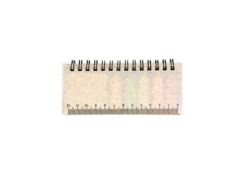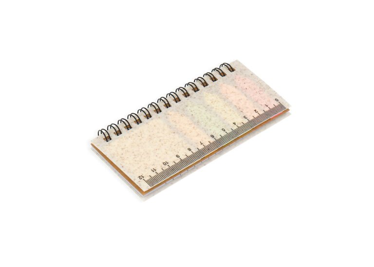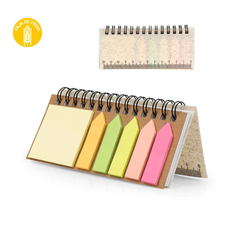 Set de memos con argollado ‘doble O’ y cubierta en paja de trigo. Incluye taco de 40 hojas rayadas y 5 juegos de banderas adhesivas en papel de colores de 25 hojas cada uno, además de una regla de guia de 12 centímetros en la tapa.