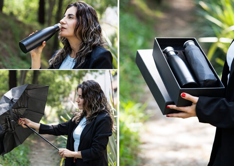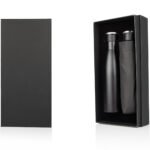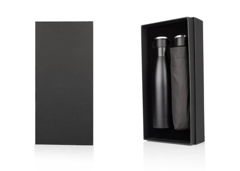 Paaraguas más botella en acero inoxidable de doble pared empacados en una elegante caja de regalo.