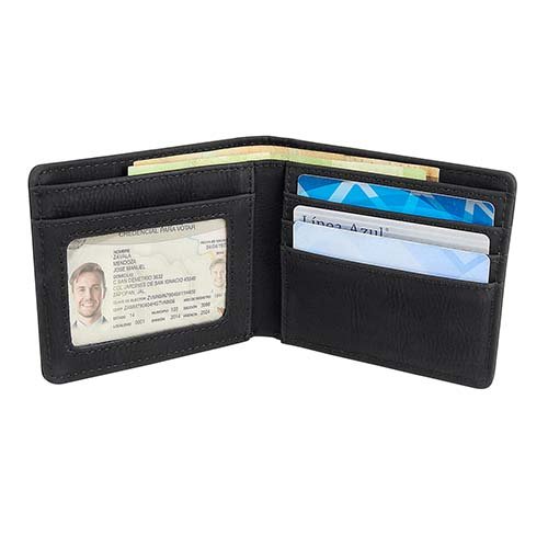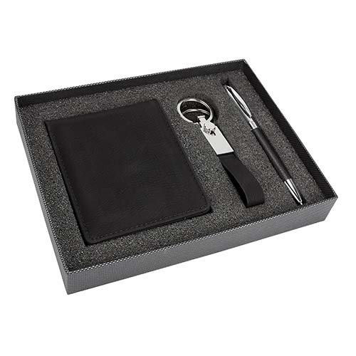 Incluye boligrafo, llavero, cartera con organizador de tarjetas, credenciales, compartimento doble para billetes y caja de regalo.
