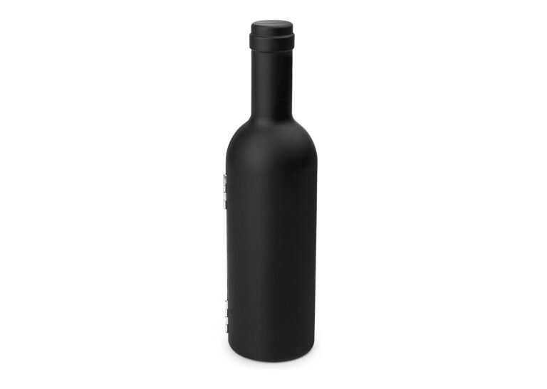 Contiene 3 accesorios de bar: Tapón para botella, aro anti goteo, sacacorchos de 1 tiempo. Caja con diseño de botella y acabado en goma.