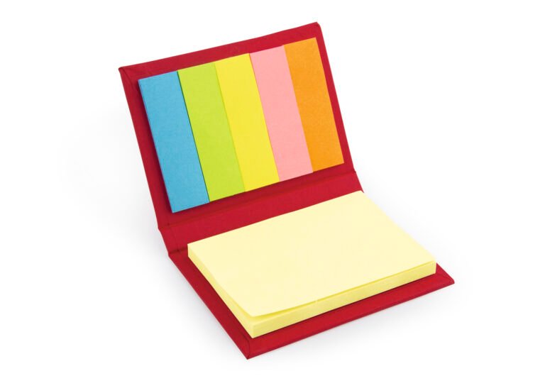 Set con taco de memos amarillos de 50 hojas y 5 tacos de banderas adhesivas en papel de colores de 25 hojas c/u. Tapa dura. Tamaño aproximado de las hojas: A8.
