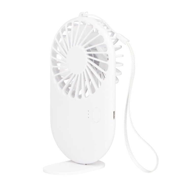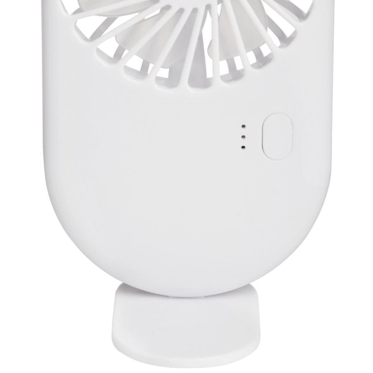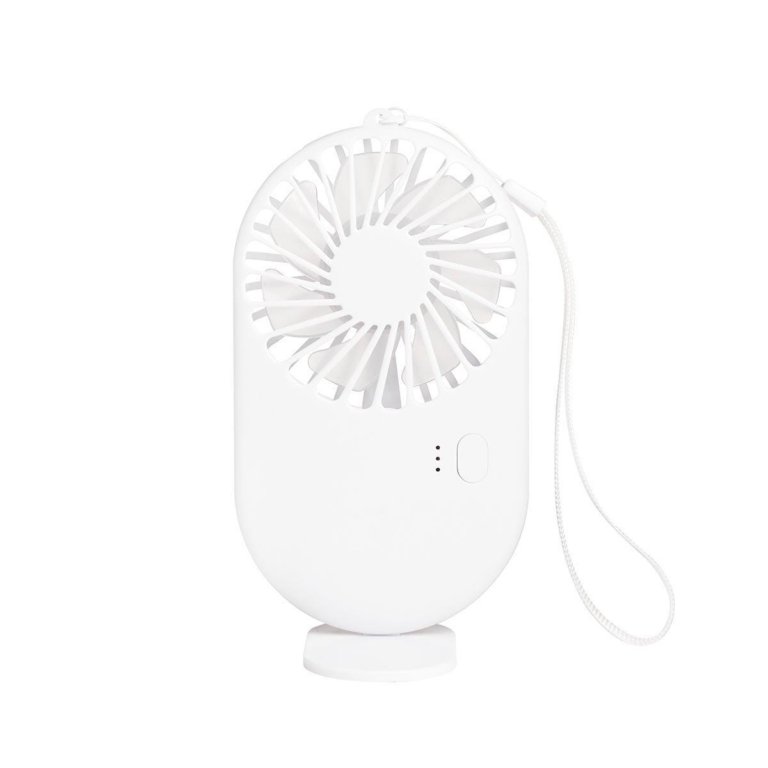 Mini ventilador de 3 velocidades con bateria recargable. Incluye base stand y cable USB.